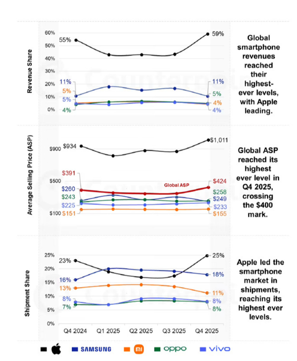 调研机构Counterpoint Research的数据显示,全球智妙手机正在2025年第四时度的平均售价初次冲破400美元,同比上涨 8%,延续了此前高端化带动ASP持续走高的趋向。国产三兄弟中,OPPO、vivo和小米比拟之前有所提拔,对应的平均售价别离是249美元(约1780元)、233美元(约合1670元)和155美元(约1110元)。其实从各家品牌的平均售价来看,苹果仍然是坐正在整个财产链顶端的厂商,也难怪有不少人会用“你要工做多久才能采办一部iPhone”来权衡本人的收入程度了,终究阵营跟它比拟差距不是一般的大,这现实确实有点扎心。